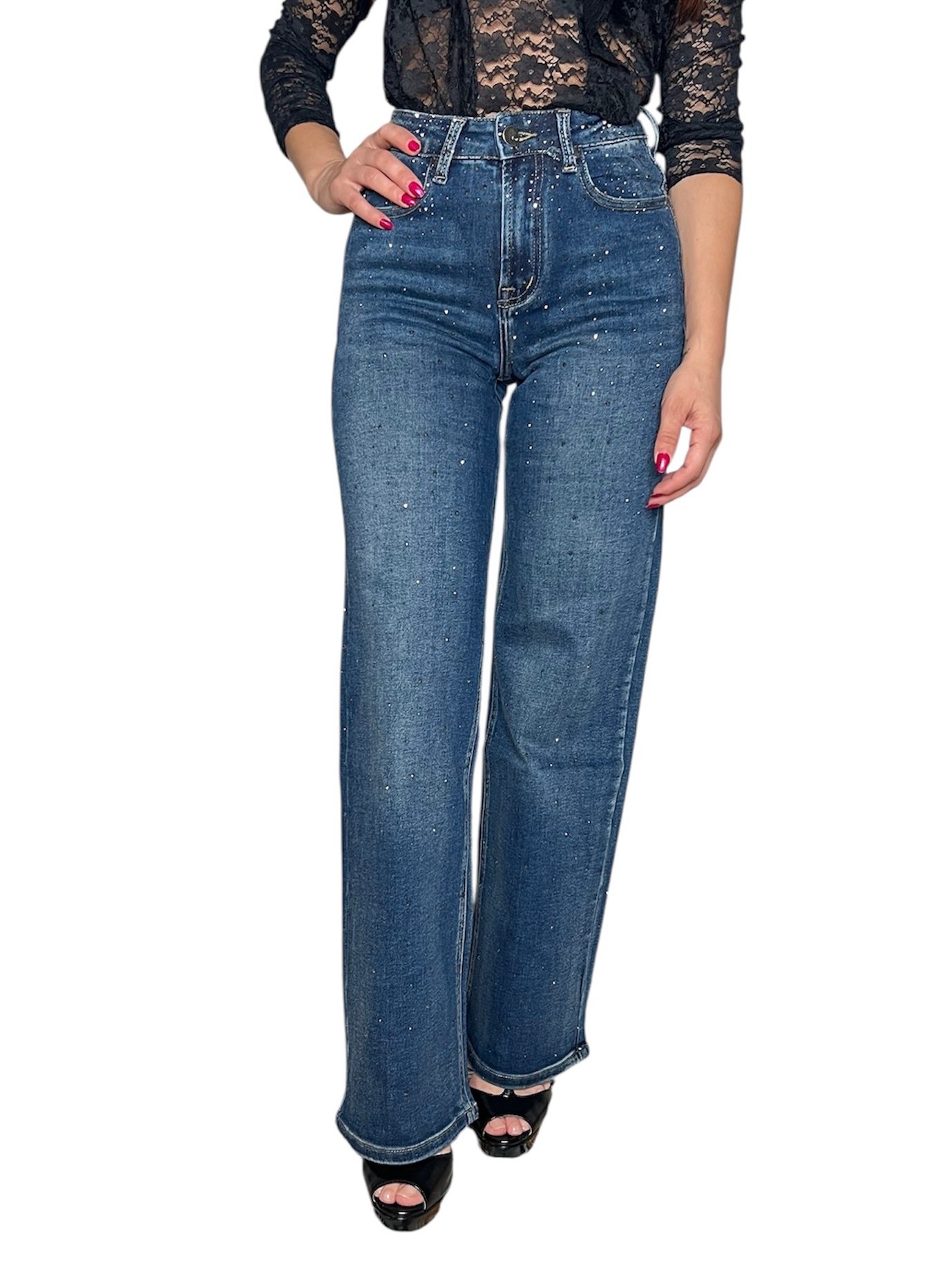 Jeans in denim blu a vita alta con gamba dritta, impreziosito da micro strass luminosi che donano un tocco chic e raffinato. Un capo versatile che unisce comfort e stile: perfetto per il giorno con sneakers o ballerine, e ideale la sera abbinato a tacchi e camicie eleganti. Realizzato in tessuto resistente con vestibilità comoda, è il jeans che illumina ogni outfit.
