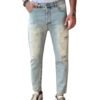 Jeans da uomo in denim lavaggio chiaro con effetto vissuto e dettagli strappati per un look deciso e street. Il taglio moderno a gamba dritta, unito alla vita media, garantisce comfort e vestibilità versatile. Le rotture sono distribuite su entrambe le gambe, senza esagerazioni, per uno stile urban ma equilibrato. Abbinato a t-shirt bianca e sneakers bianche con dettagli scuri, è perfetto per outfit casual e dinamici, ideali per il tempo libero o uscite serali.